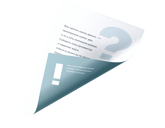 Личный кредит без посредников означает, что вы получаете деньги под недвижимость напрямую у частного инвестора. Мы не брокеры, а значит, не помогаем получить кредит в МФО, заказать кредитную карту в банке или получить деньги под расписку.
